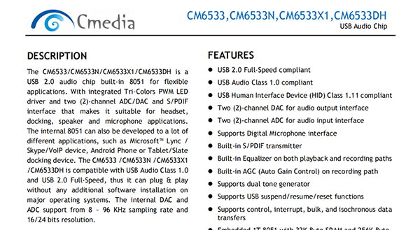 The CM6533/CM6533N/CM6533X1/CM6533DH is a USB 2.0 audio chip built-in 8051 for flexible applications