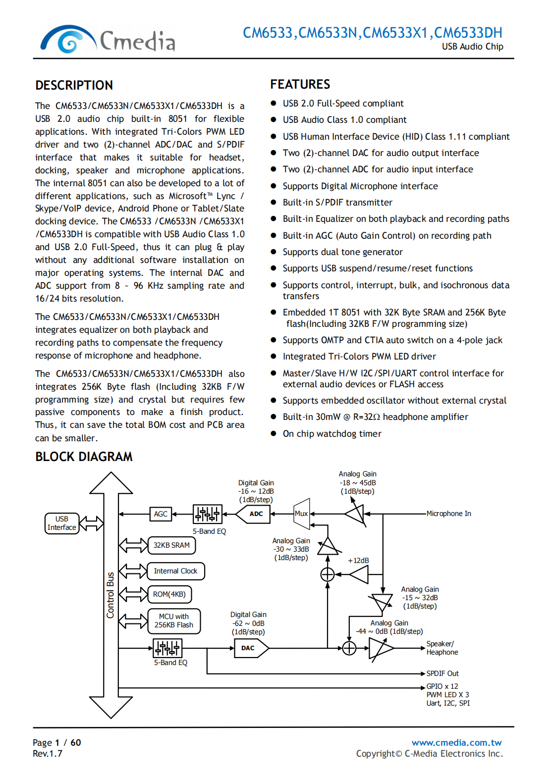 The CM6533/CM6533N/CM6533X1/CM6533DH is a USB 2.0 audio chip built-in 8051 for flexible applications