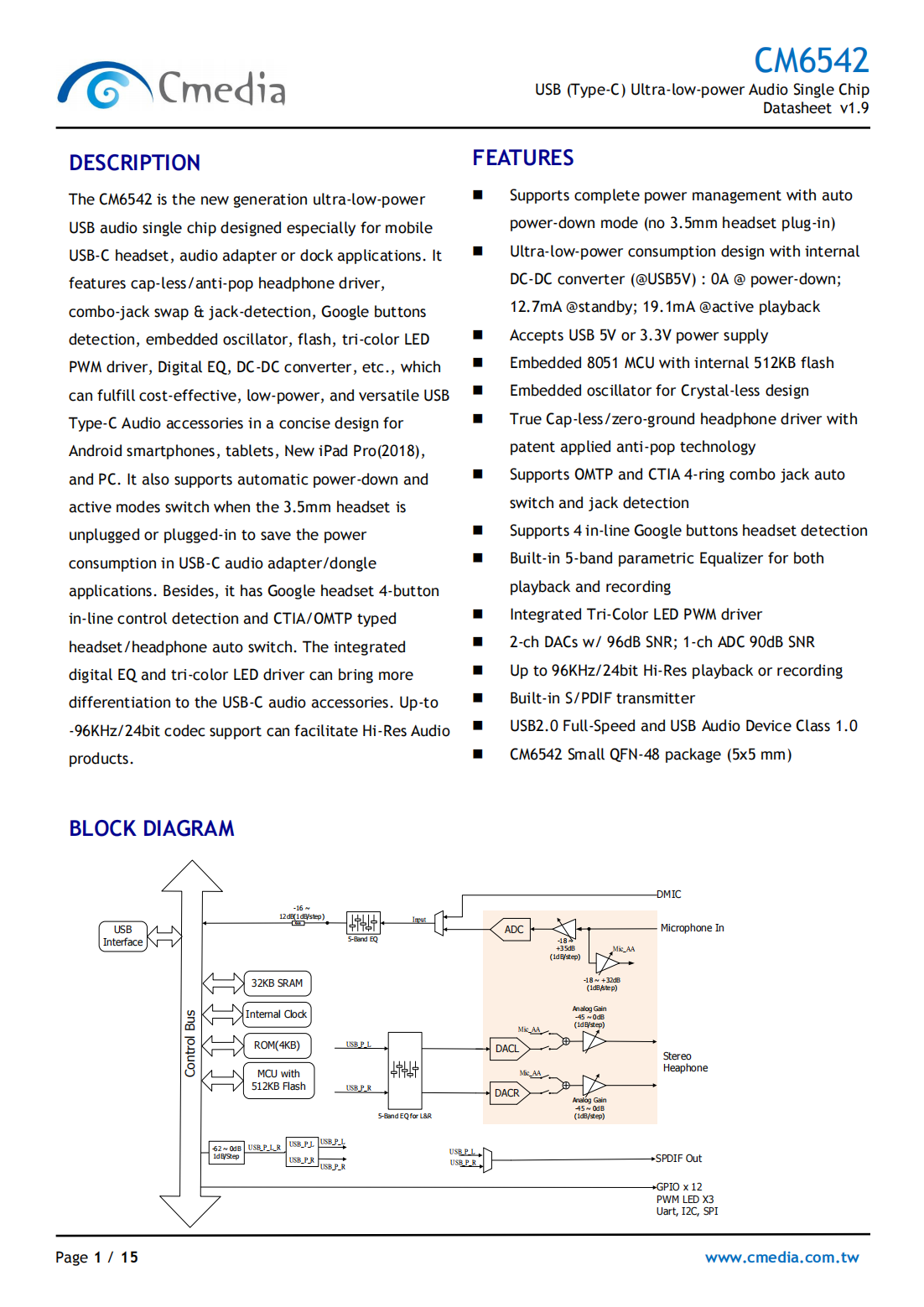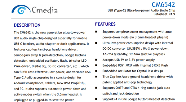 The CM6542 is the new generation ultra-low-power USB audio single chip designed especially for mobile USB-C headset, audio adapter or dock applications. It features cap-less/anti-pop headphone driver, combo-jack swap & jack-detection, Google buttons detection, embedded oscillator, flash, tri-color LED PWM driver, Digital EQ, DC-DC converter, etc., which can fulfill cost-effective, low-power, and versatile USB Type-C Audio accessories in a concise design for Android smartphones, tablets, New iPad Pro(2018), and PC. It also supports automatic power-down and active modes switch when the 3.5mm headset is unplugged or plugged-in to save the power consumption in USB-C audio adapter/dongle applications. Besides, it has Google headset 4-button in-line control detection and CTIA/OMTP typed headset/headphone auto switch. The integrated digital EQ and tri-color LED driver can bring more differentiation to the USB-C audio accessories. Up-to -96KHz/24bit codec support can facilitate Hi-Res Audio products.