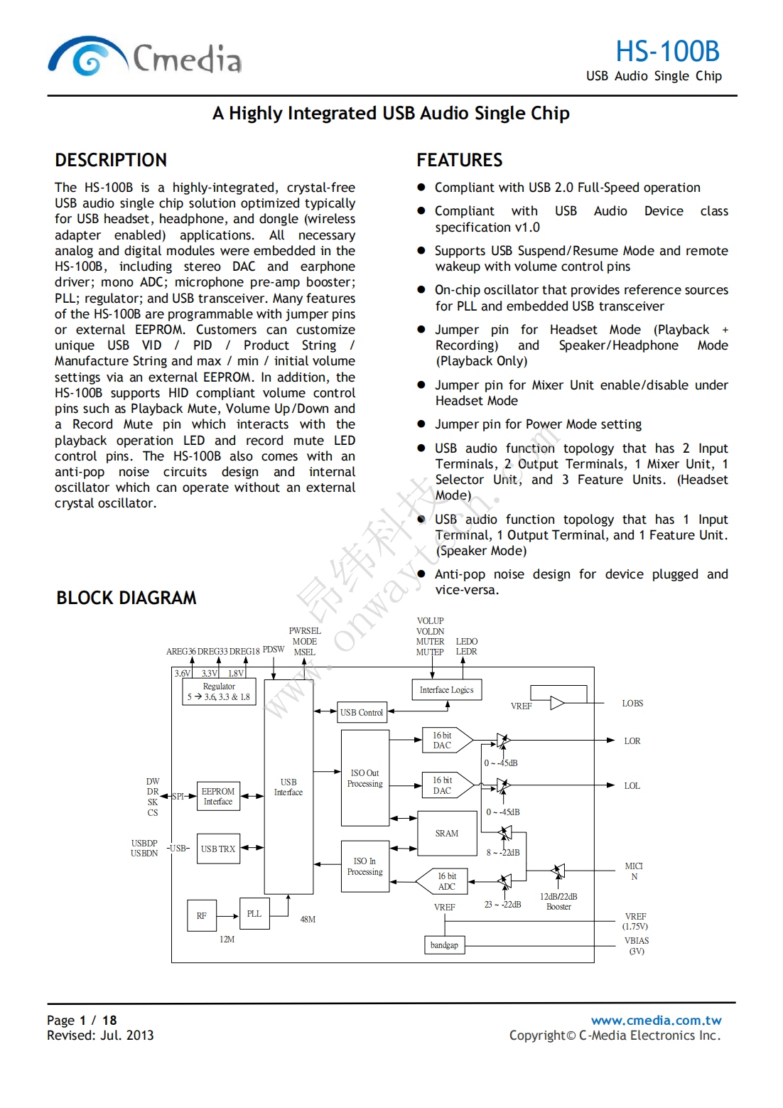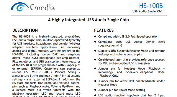 HS-100B is a highly integrated single chip USB audio solution. All essential analog modules are embedded in HS-100B, including dual DAC and headphone amplifier, ADC, microphone booster, PLL, crystal-less design, regulator, anti-pop circuitry and USB transceiver. Many features are programmable with jumper pins or external EEPROM. In addition, audio adjustment can be easily controlled via specific HID compliant volume control pins.