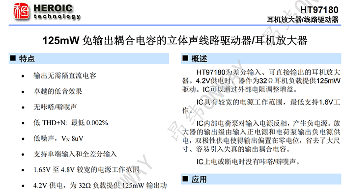 HT97180(L)是一款差分輸入/單端輸入、可直接輸出驅(qū)動的耳機放大器/線路驅(qū)動器。4.2V供電時,器件可為32ohm耳機提供125mW的功率而不失真。器件可通過外部電阻調(diào)節(jié)增益(固定增益6dB版本需要提前定制)。器件在音頻范圍內(nèi)具有卓越的THD+N表現(xiàn)。