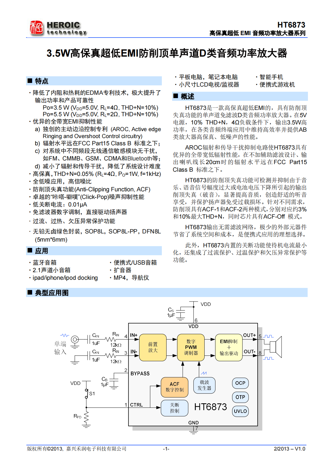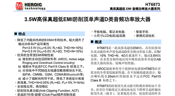 HT6873是一款高保真超低EMI的,具有防削頂失真功能的單聲道免濾波D類音頻功率放大器。在5V電源,10%THD+N,4Ω負載條件下,輸出3.5W高功率,在各類音頻終端應用中維持高效率并提供AB類放大器高保真、低噪聲的性能。AROC輻射和傳導干擾抑制電路使HT6873具有優(yōu)異的全帶寬低輻射性能,在不加輔助濾波設計、輸出喇叭線長20cm時的輻射水平遠在FCC Part15 Class B標準之下。