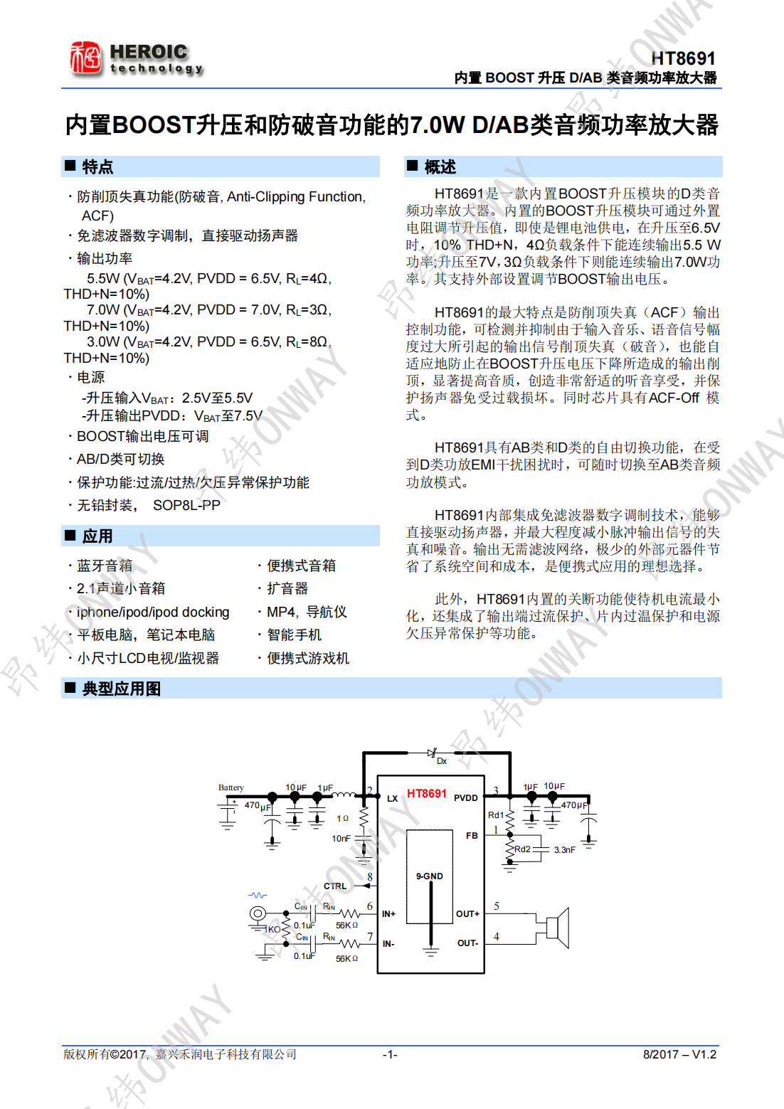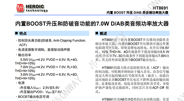 HT8691是一款內置BOOST升壓模塊的D類音頻功率放大器。內置的BOOST升壓模塊可通過外置電阻調節(jié)升壓值,即使是鋰電池供電,在升壓至6.5V時,10%THD+N,4Ω負載條件下能連續(xù)輸出5.5 W功率;升壓至7V,3Ω負載條件下則能連續(xù)輸出7.0W功率。其支持外部設置調節(jié)BOOST輸出電壓。HT8691的最大特點是防削頂失真(ACF)輸出控制功能,可檢測并抑制由于輸入音樂、語音信號幅度過大所引起的輸出信號削頂失真(破音),也能自適應地防止在BOOST升壓電壓下降所造成的輸出削頂,顯著提高音質,創(chuàng)造非常舒適的聽音享受,并保護揚聲器免受過載損壞。同時芯片具有ACF-Off模式。