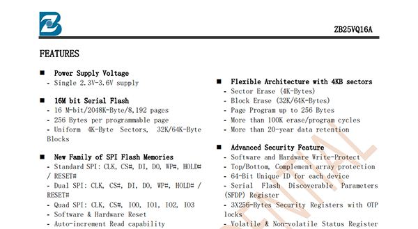 The ZB25VQ16A of non-volatile flash memory device supports the standard Serial Peripheral Interface (SPI)