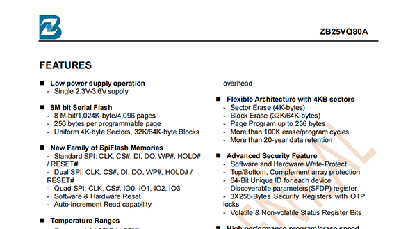 The ZB25VQ80A of non-volatile flash memory device supports the standard Serial Peripheral Interface (SPI).