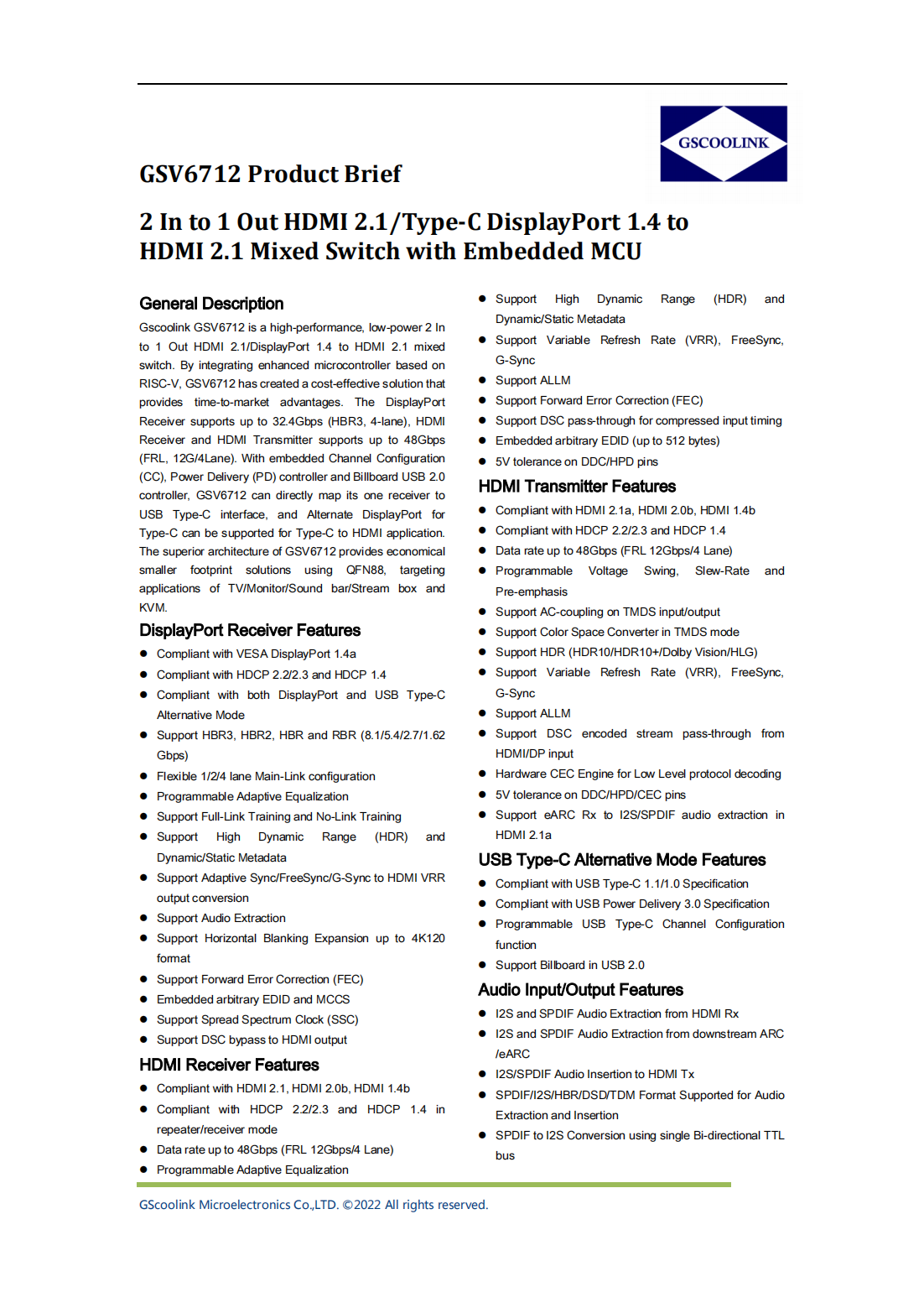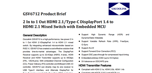 ·Gscoolink GSV6712是一款高性能、低功耗的2-IN-1-OUT芯片。