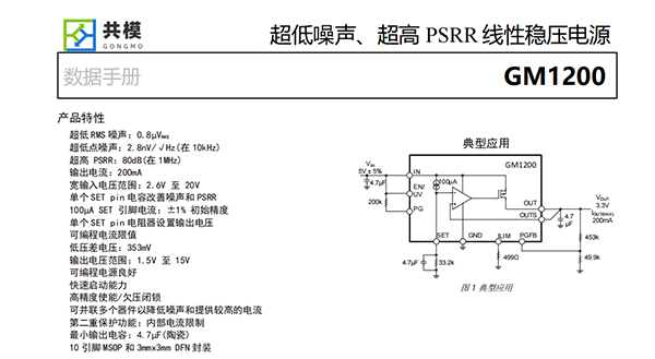 GM1200是一款高性能低壓差線性穩(wěn)壓電源,其采用的超低噪聲和超高電源抑制比(PSRR)架構(gòu)對噪聲敏感的信號采集和無線通信應(yīng)用供電。GM1200被設(shè)計(jì)為一個(gè)高性能電流基準(zhǔn)后跟隨一個(gè)高性能電壓緩沖器,其可容易地通過并聯(lián)以進(jìn)一步降低噪聲、增加輸出電流和改善PCB上的散熱量。