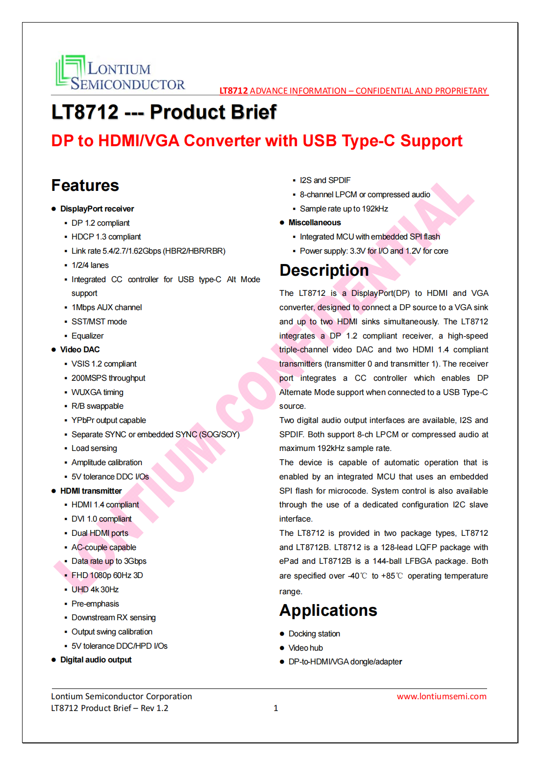 The LT8712 is a DisplayPort(DP) to HDMI and VGA converter, designed to connect a DP source to a VGA sink and up to two HDMI sinks simultaneously