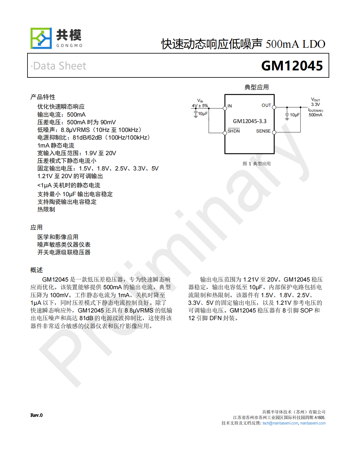 GM12045是一款低壓差穩(wěn)壓器,專為快速瞬態(tài)響應(yīng)而優(yōu)化。該裝置能夠提供500mA的輸出電流,典型壓降為100mV。工作靜態(tài)電流為1mA,關(guān)機(jī)時(shí)降至1μA以下,同時(shí)壓差模式下靜態(tài)電流控制良好。除了快速瞬態(tài)響應(yīng)外,GM12045還具有8.8μVRMS的低輸出電壓噪聲和高達(dá)81dB的電源紋波抑制比,這使得該器件非常適合敏感的儀器儀表和醫(yī)療影像應(yīng)用。