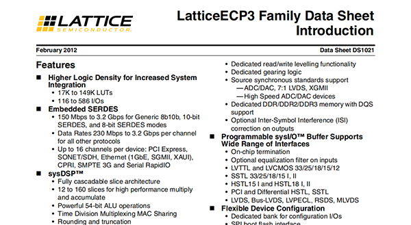 The LatticeECP3? (EConomy Plus Third generation) family of FPGA devices is optimized to deliver high performance features such as an enhanced DSP architecture, high speed SERDES and high speed source synchronous interfaces in an economical FPGA fabric