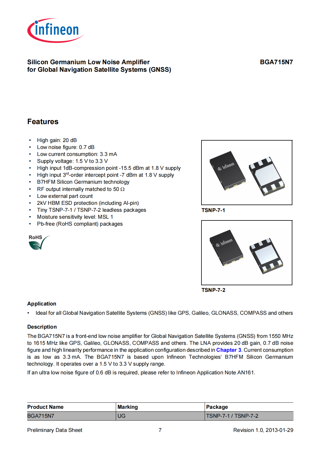 The BGA715N7 is a front-end low noise amplifier for Global Navigation Satellite Systems(GNSS)from 1550 MHz to 1615 MHz like GPS,Galileo,GLONASS,COMPASS and others.The LNA provides 20 dB gain,0.7 dB noise figure and high linearity performance in the application configuration described in Chapter 3.Current consumption is as low as 3.3 mA.The BGA715N7 is based upon Infineon Technologies‘B7HFM Silicon Germanium technology.It operates over a 1.5 V to 3.3 V supply range.If an ultra low noise figure of 0.6 dB is required,please refer to Infineon Application Note AN161.