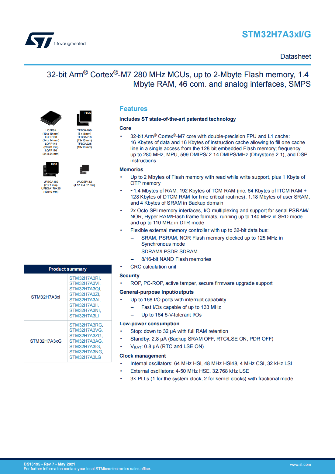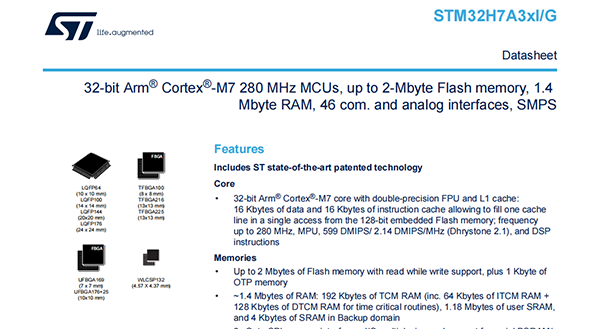 32-bit Arm? Cortex?-M7 280 MHz MCUs, up to 2-Mbyte Flash memory, 1.4 Mbyte RAM, 46 com. and analog interfaces, SMPS