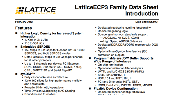 The LatticeECP3? (EConomy Plus Third generation) family of FPGA devices is optimized to deliver high performance features such as an enhanced DSP architecture, high speed SERDES and high speed source synchronous interfaces in an economical FPGA fabric