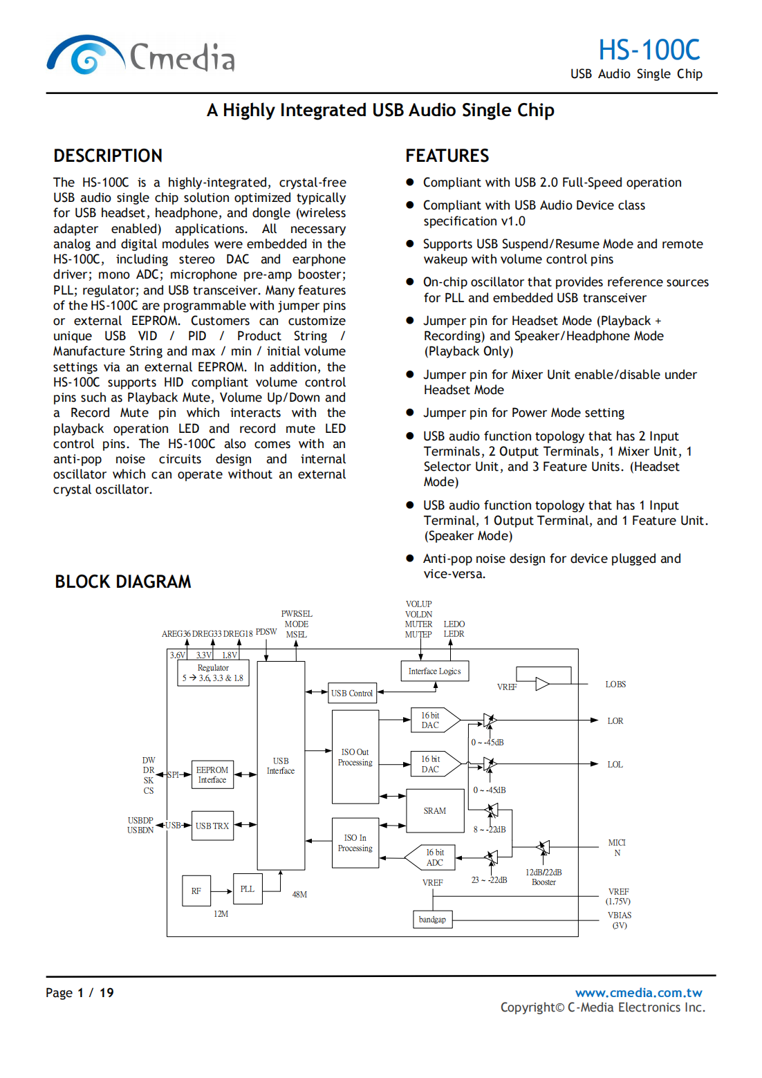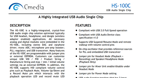The HS-100C is a highly-integrated,crystal-free USB audio single chip solution optimized typically for USB headset,headphone,and dongle(wireless adapter enabled)applications.All necessary analog and digital modules were embedded in the HS-100C,including stereo DAC and earphone driver;mono ADC;microphone pre-amp booster;PLL;regulator;and USB transceiver.Many features of the HS-100C are programmable with jumper pins or external EEPROM.Customers can customize unique USB VID/PID/Product String/Manufacture String and max/min/initial volume settings via an external EEPROM.In addition,the HS-100C supports HID compliant volume control pins such as Playback Mute,Volume Up/Down and a Record Mute pin which interacts with the playback operation LED and record mute LED control pins.The HS-100C also comes with an anti-pop noise circuits design and internal oscillator which can operate without an external crystal oscillator.