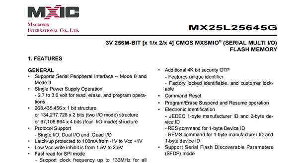 MX25L25645G is 256Mb bits Serial NOR Flash memory,which is configured as 33,554,432 x 8 internally.When it is in two or four I/O mode,the structure becomes 134,217,728 bits x 2 or 67,108,864 bits x 4.
