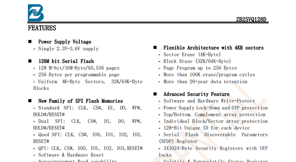 The ZB25VQ128D of non-volatile flash memory device supports the standard Serial Peripheral Interface(SPI).Traditional SPI single bit serial input and output(Single I/O or SIO)is supported as well as optional two bit(Dual I/O or DIO)and four bit(quad I/O or QIO)serial protocols.This multiple width interface is called SPI Multi-I/O or MIO.