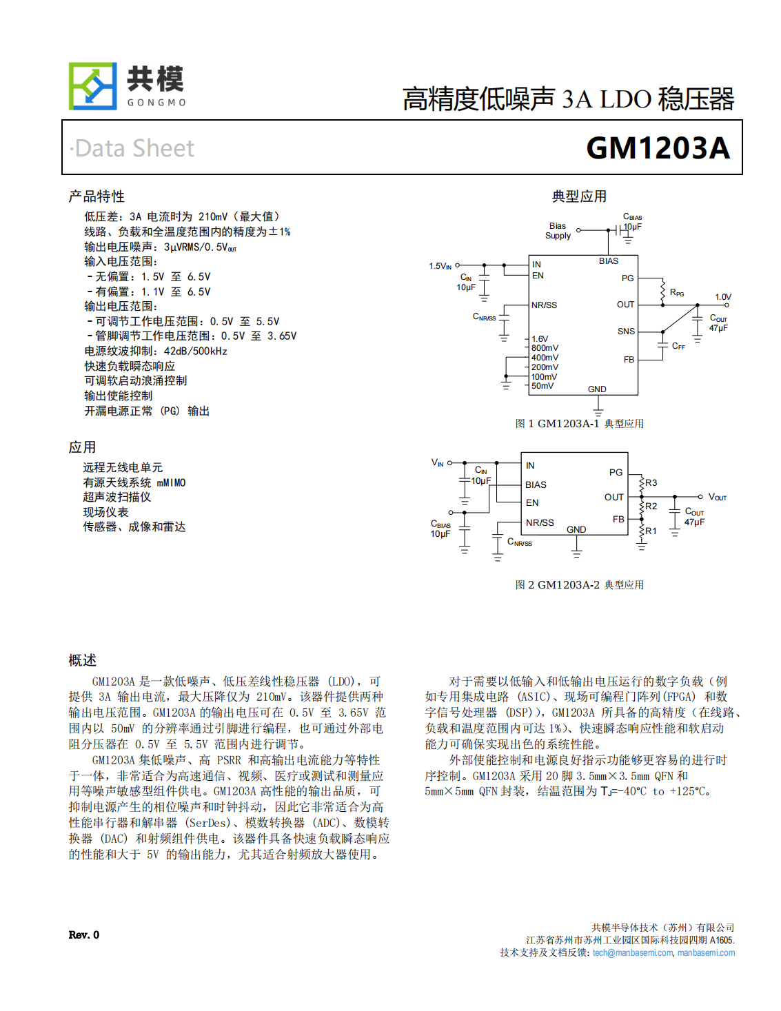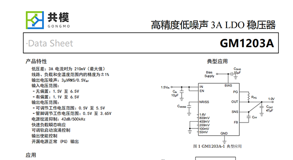 GM1203A是一款低噪聲、低壓差線性穩(wěn)壓器(LDO),可提供3A輸出電流,最大壓降僅為210mV。該器件提供兩種輸出電壓范圍。GM1203A的輸出電壓可在0.5V至3.65V范圍內以50mV的分辨率通過引腳進行編程,也可通過外部電阻分壓器在0.5V至5.5V范圍內進行調節(jié)。