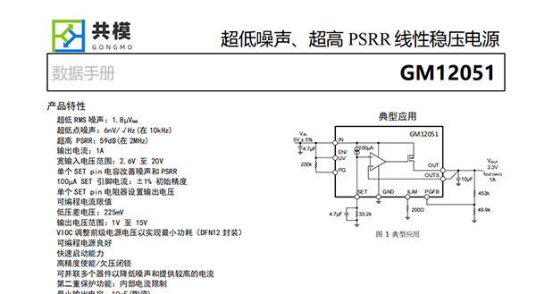 GM12051是一款高性能低壓差線性穩(wěn)壓電源,其采用的超低噪聲和超高電源抑制比(PSRR)架構(gòu)對噪聲敏感的信號采集和無線通信應用供電。GM12051被設計為一個高性能電流基準后跟隨一個高性能電壓緩沖器,其可容易地通過并聯(lián)以進一步降低噪聲、增加輸出電流和改善PCB上的散熱量。