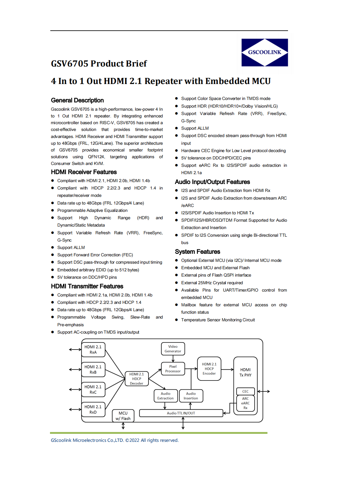 Gscoolink GSV6705 is a high-performance,low-power 4 In to 1 Out HDMI 2.1 repeater.By integrating enhanced microcontroller based on RISC-V,GSV6705 has created a cost-effective solution that provides time-to-market advantages.HDMI Receiver and HDMI Transmitter support up to 48Gbps(FRL,12G/4Lane).The superior architecture of GSV6705 provides economical smaller footprint solutions using QFN124,targeting applications of Consumer Switch and KVM.