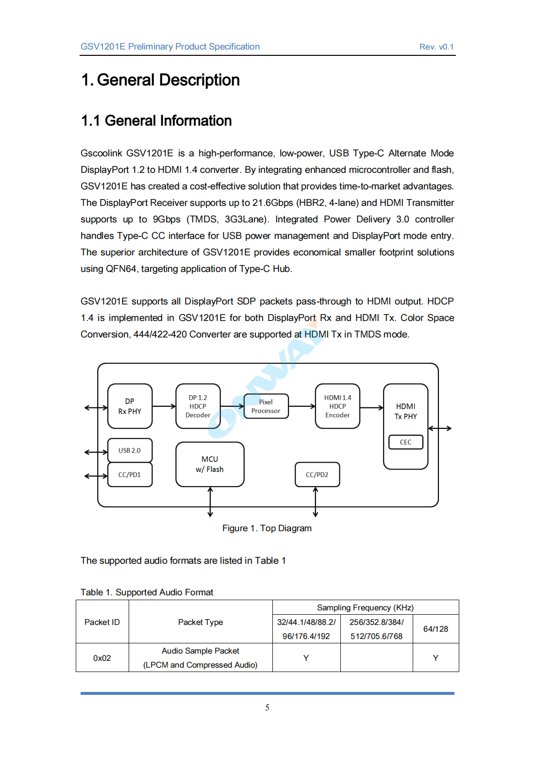 The superior architecture of GSV1201E provides economical smaller footprint solutionsusing QFN64,targeting application of Type-C Hub.GSV1201E supports all DisplayPort SDP packets pass-through to HDMI output.HDCP 1.4 is implemented in GSV1201E for both DisplayPort Rx and HDMI Tx.Color Space Conversion,444/422-420 Converter are supported at HDMI Tx in TMDS mode