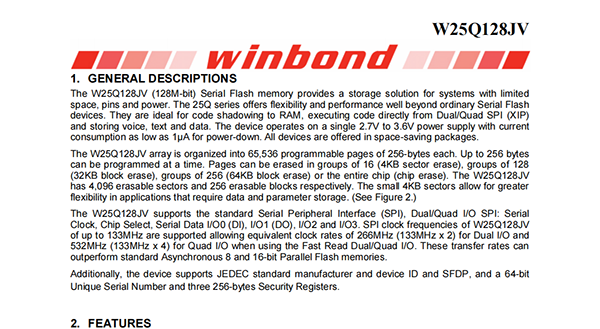 The W25Q128JV supports the standard Serial Peripheral Interface(SPI),Dual/Quad I/O SPI:Serial Clock,Chip Select,Serial Data I/O0(DI),I/O1(DO),I/O2 and I/O3.SPI clock frequencies of W25Q128JV of up to 133MHz are supported allowing equivalent clock rates of 266MHz(133MHz x 2)for Dual I/O and 532MHz(133MHz x 4)for Quad I/O when using the Fast Read Dual/Quad I/O.These transfer rates can outperform standard Asynchronous 8 and 16-bit Parallel Flash memories.Additionally,the device supports JEDEC standard manufacturer and device ID and SFDP,and a 64-bit Unique Serial Number and three 256-bytes Security Registers.
