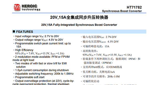 HT71782具有2.7V至20V寬輸入電壓范圍,可為采用單節(jié)或兩節(jié)鋰電池的應用提供支持。該器件具備15A開關電流能力,并且能夠提供20V的輸出電壓。