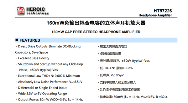 HT97226是一款差分輸入/單端輸入、可直接輸出驅(qū)動(dòng)的耳機(jī)放大器。5V供電時(shí),器件可為32ohm耳機(jī)提供180mW的功率。器件可通過(guò)外部電阻調(diào)節(jié)增益。器件在音頻范圍內(nèi)具有卓越的THD+N表現(xiàn)。