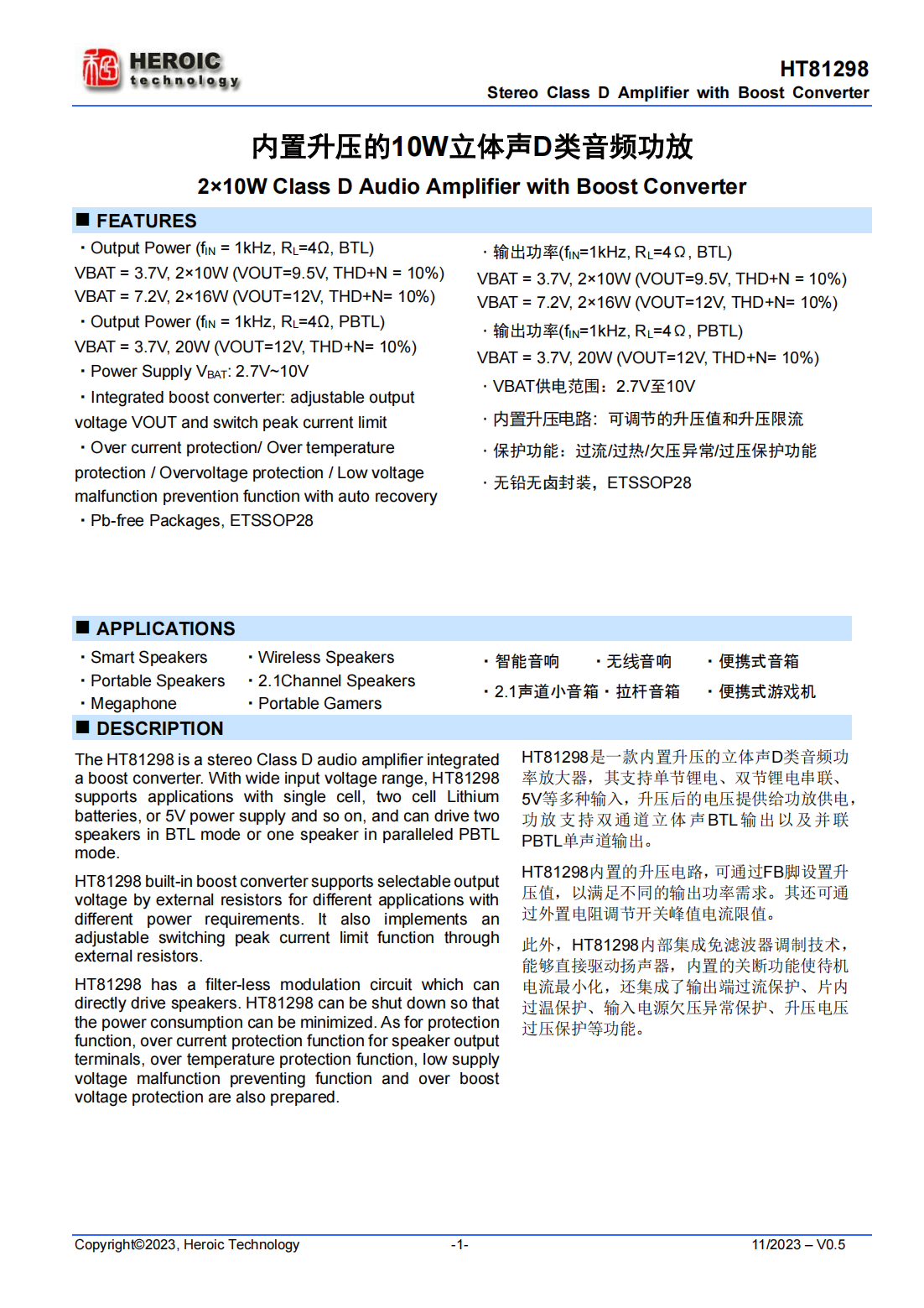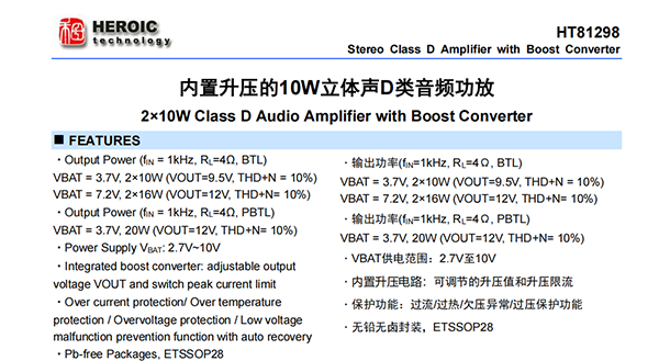 HT81298是一款內(nèi)置升壓的立體聲D類音頻功率放大器,其支持單節(jié)鋰電、雙節(jié)鋰電串聯(lián)、5V等多種輸入,升壓后的電壓提供給功放供電,功放支持雙通道立體聲BTL輸出以及并聯(lián)PBTL單聲道輸出。