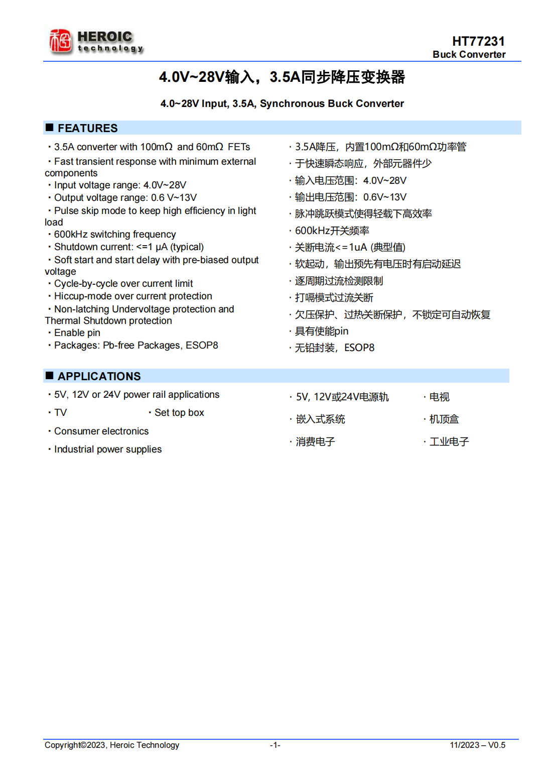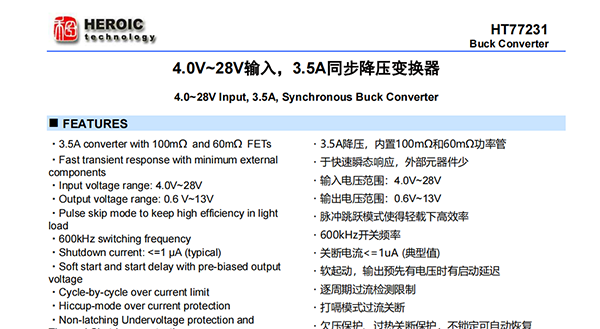 HT77231是一款3.5A降壓轉(zhuǎn)換器,具有最少的外部元件和低關(guān)斷電流。該器件具有快速瞬態(tài)響應(yīng)的特點,輸出電容器采用低ESR(聚合物)或超低ESR(陶瓷),無需外部補(bǔ)償。該器件在輕載時以脈沖跳躍模式工作,達(dá)到高效。