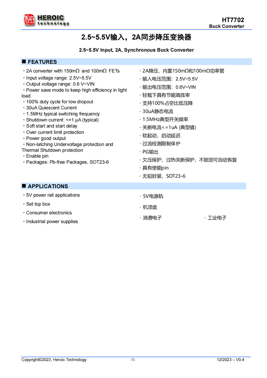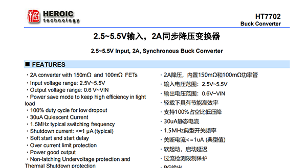 HT7702是一款2A同步降壓轉(zhuǎn)換器,具有最少的外部元件和低關(guān)斷電流。該器件在中到重載時(shí),工作在典型開關(guān)頻率為1.5MHz的PWM模式;在輕載時(shí),器件工作在高效節(jié)能模式。輸出電壓可通過外部電阻調(diào)節(jié)。HT7702采用SOT23-6封裝。
