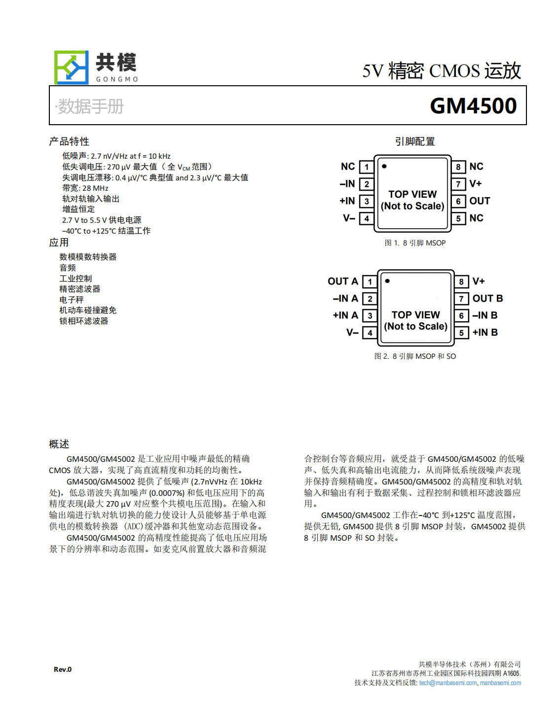 GM4500/GM45002工作在?40°C到+125°C溫度范圍,提供無鉛,GM4500提供8引腳MSOP封裝,GM45002提供8引腳MSOP和SO封裝。