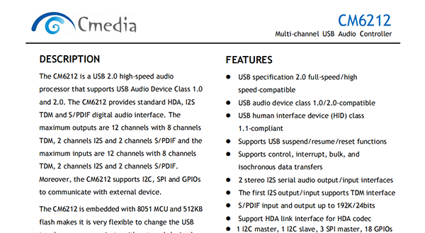 The CM6212 is a USB 2.0 high-speed audio processor that supports USB Audio Device Class 1.0and 2.0.The CM6212 provides standard HDA,I2S TDM and S/PDIF digital audio interface.The maximum outputs are 12 channels with 8 channels TDM,2 channels I2S and 2 channels S/PDIF and the maximum inputs are 12 channels with 8 channels TDM,2 channels I2S and 2 channels S/PDIF.Moreover,the CM6212 supports I2C,SPI and GPIOs to communicate with external device.