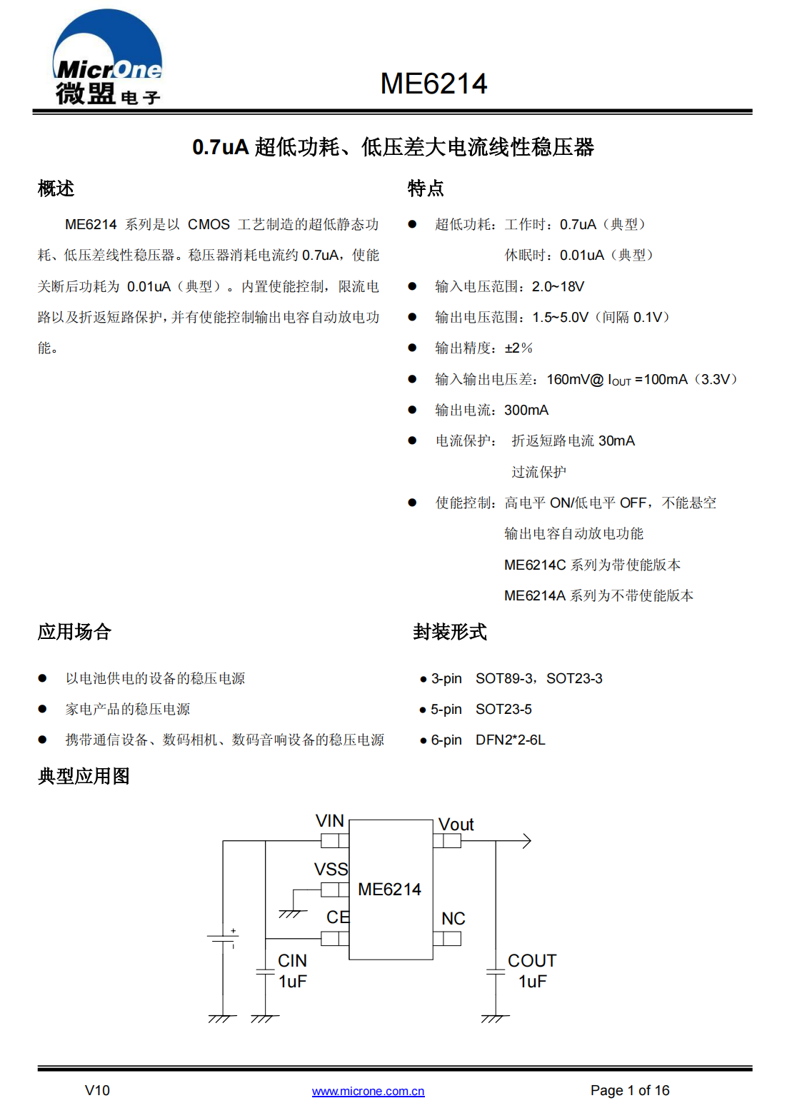 ME6214系列是以CMOS工藝制造的超低靜態(tài)功耗、低壓差線性穩(wěn)壓器。穩(wěn)壓器消耗電流約0.7uA,使能關斷后功耗為0.01uA(典型)。內(nèi)置使能控制,限流電路以及折返短路保護,并有使能控制輸出電容自動放電功能。