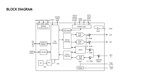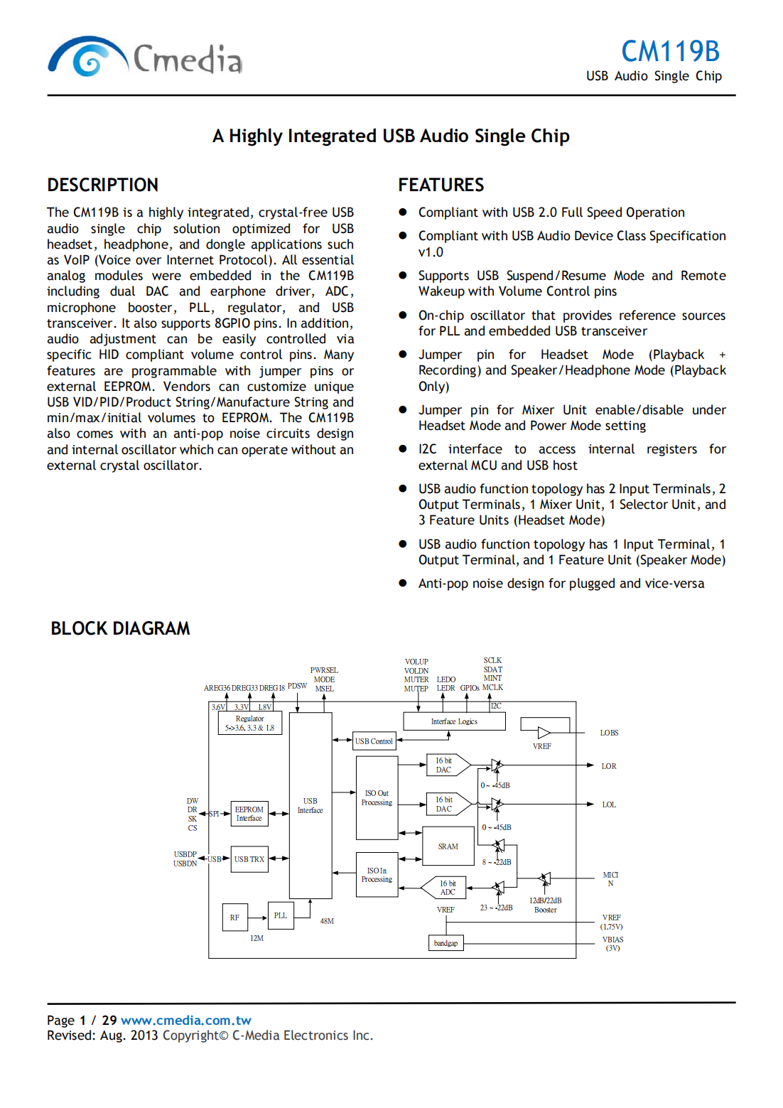 The CM119B is a highly integrated,crystal-free USB audio single chip solution optimized for USB headset,headphone,and dongle applications such as VoIP(Voice over Internet Protocol).All essential analog modules were embedded in the CM119B including dual DAC and earphone driver,ADC,microphone booster,PLL,regulator,and USB transceiver.It also supports 8GPIO pins.In addition,audio adjustment can be easily controlled via specific HID compliant volume control pins.Many features are programmable with jumper pins or external EEPROM.Vendors can customize unique USB VID/PID/Product String/Manufacture String and min/max/initial volumes to EEPROM.The CM119B also comes with an anti-pop noise circuits design and internal oscillator which can operate without an external crystal oscillator.