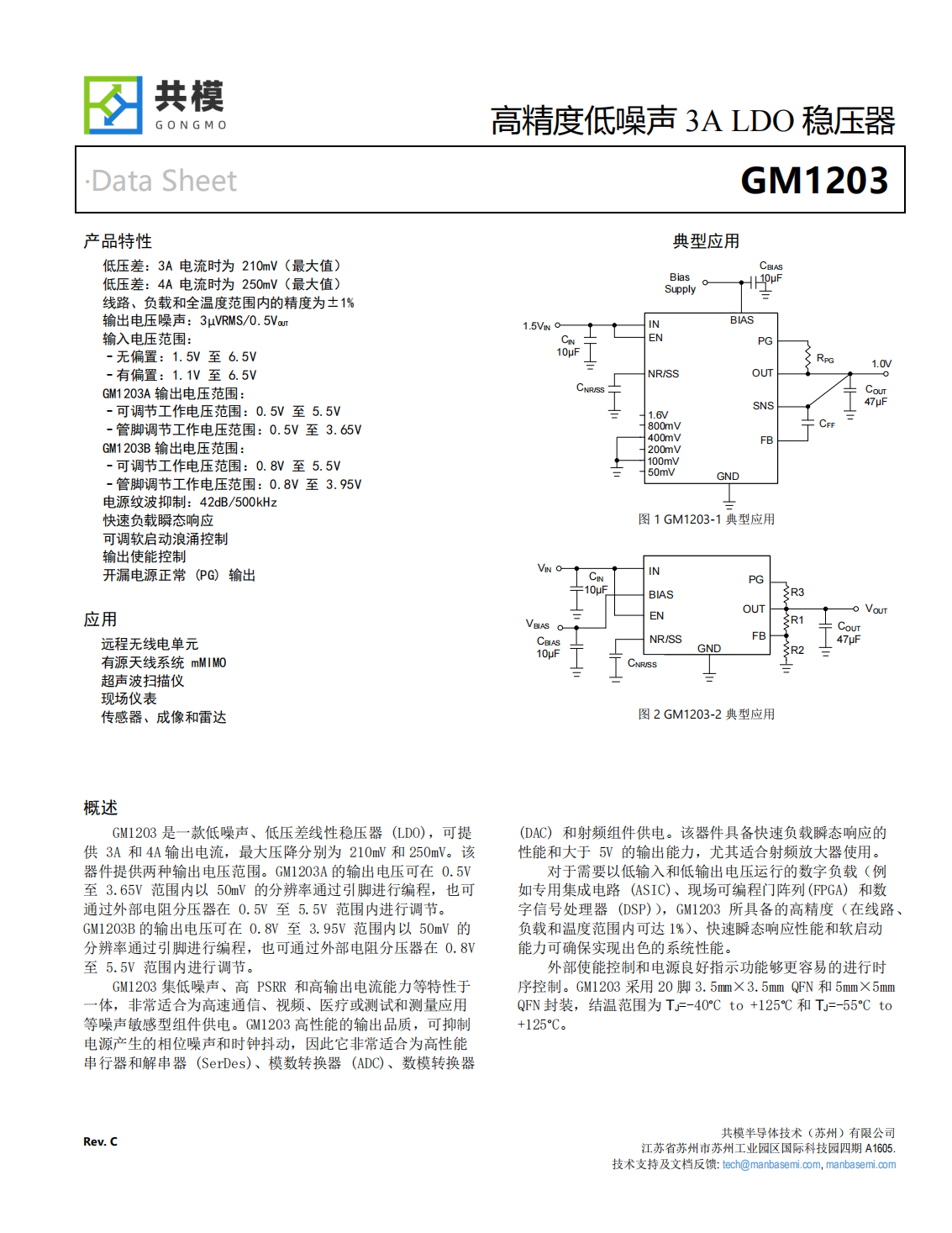 GM1203集低噪聲、高PSRR和高輸出電流能力等特性于一體,非常適合為高速通信、視頻、醫(yī)療或測試和測量應(yīng)用等噪聲敏感型組件供電。GM1203高性能的輸出品質(zhì),可抑制電源產(chǎn)生的相位噪聲和時鐘抖動,因此它非常適合為高性能串行器和解串器(SerDes)、模數(shù)轉(zhuǎn)換器(ADC)、數(shù)模轉(zhuǎn)換器(DAC)和射頻組件供電。該器件具備快速負載瞬態(tài)響應(yīng)的性能和大于5V的輸出能力,尤其適合射頻放大器使用。對于需要以低輸入和低輸出電壓運行的數(shù)字負載(例如專用集成電路(ASIC)、現(xiàn)場可編程門陣列(FPGA)和數(shù)字信號處理器(DSP)),GM1203所具備的高精度(在線路、負載和溫度范圍內(nèi)可達1%)、快速瞬態(tài)響應(yīng)性能和軟啟動能力可確保實現(xiàn)出色的系統(tǒng)性能。外部使能控制和電源良好指示功能夠更容易的進行時序控制。GM1203采用20腳3.5mm×3.5mm QFN和5mm×5mm QFN封裝,結(jié)溫范圍為TJ=-40°C to+125°C和TJ=-55°C to+125°C。