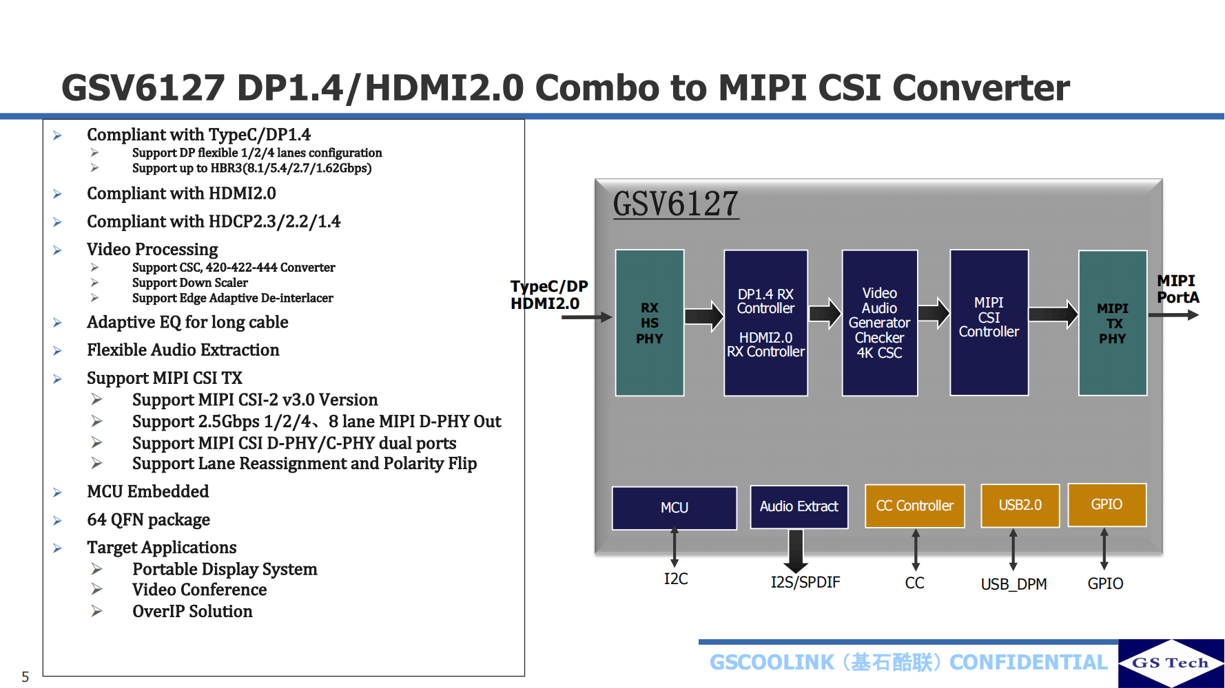 Gscoolink GSV6127是一款高性能、低功耗HDMI 2.0/DisplayPort 1.4到MIPI CSI-2混合轉(zhuǎn)換器。通過集成基于RISC-V的增強(qiáng)型微控制器,GSV6127創(chuàng)造了一種具有成本效益的解決方案。DisplayPort接收支持高達(dá)32.4Gbps(HBR3,4通道),HDMI接收和HDMI發(fā)送支持高達(dá)18Gbps(TMDS,6G/3Lane)。通過嵌入式信道配置(CC)、電源傳輸(PD)控制器和USB 2.0控制器,GSV6127可以支持Type-C到MIPI應(yīng)用程序的Type-C備用顯示端口。