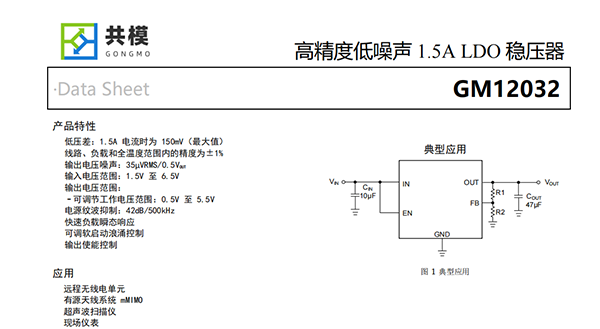 GM12032集低噪聲、高PSRR和高輸出電流能力等特性于一體,非常適合為高速通信、視頻、醫(yī)療或測試和測量應用等噪聲敏感型組件供電。GM12032高性能的輸出品質(zhì),可抑制電源產(chǎn)生的相位噪聲和時鐘抖動,因此它非常適合為高性能串行器和解串器(SerDes)、模數(shù)轉(zhuǎn)換器(ADC)、數(shù)模轉(zhuǎn)換器(DAC)和射頻組件供電。該器件具備快速負載瞬態(tài)響應的性能和大于5V的輸出能力,尤其適合射頻放大器使用。對于需要以低輸入和低輸出電壓運行的數(shù)字負載(例如專用集成電路(ASIC)、現(xiàn)場可編程門陣列(FPGA)和數(shù)字信號處理器(DSP)),GM12032所具備的高精度(在線路、負載和溫度范圍內(nèi)可達1%)、快速瞬態(tài)響應性能和軟啟動能力可確保實現(xiàn)出色的系統(tǒng)性能。外部使能控制和電源良好指示功能夠更容易的進行時序控制。GM12032采用8腳PSOP封裝,結(jié)溫范圍為TJ=-40°C至+125°C。