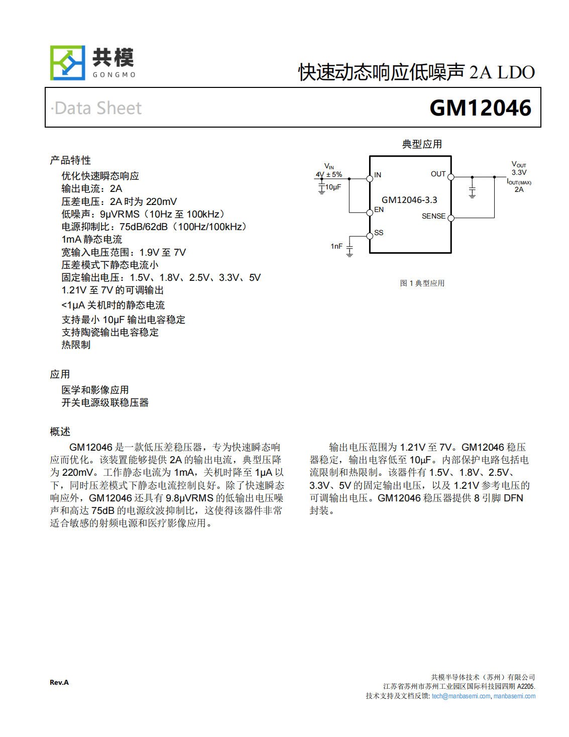 GM12046是一款低壓差穩(wěn)壓器,專為快速瞬態(tài)響應而優(yōu)化。該裝置能夠提供2A的輸出電流,典型壓降為220mV。工作靜態(tài)電流為1mA,關機時降至1μA以下,同時壓差模式下靜態(tài)電流控制良好。除了快速瞬態(tài)響應外,GM12046還具有9.8μVRMS的低輸出電壓噪聲和高達75dB的電源紋波抑制比,這使得該器件非常適合敏感的射頻電源和醫(yī)療影像應用。輸出電壓范圍為1.21V至7V。