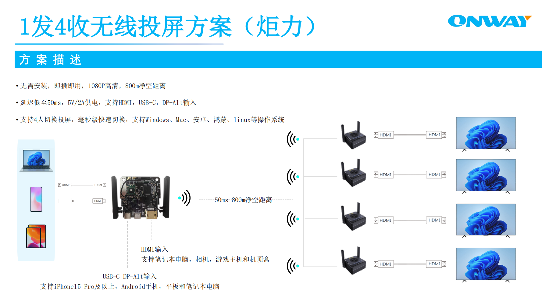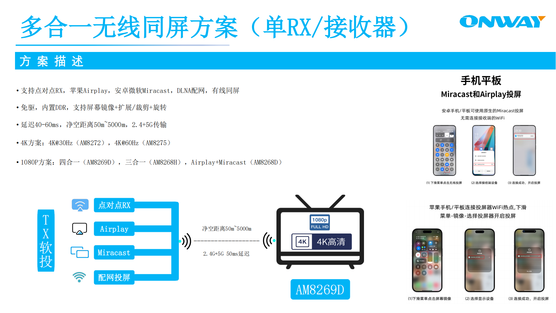 支持點(diǎn)對(duì)點(diǎn)RX,蘋果Airplay點(diǎn)對(duì)點(diǎn),微軟安卓Miracast,DLNA配網(wǎng)投,有線同屏