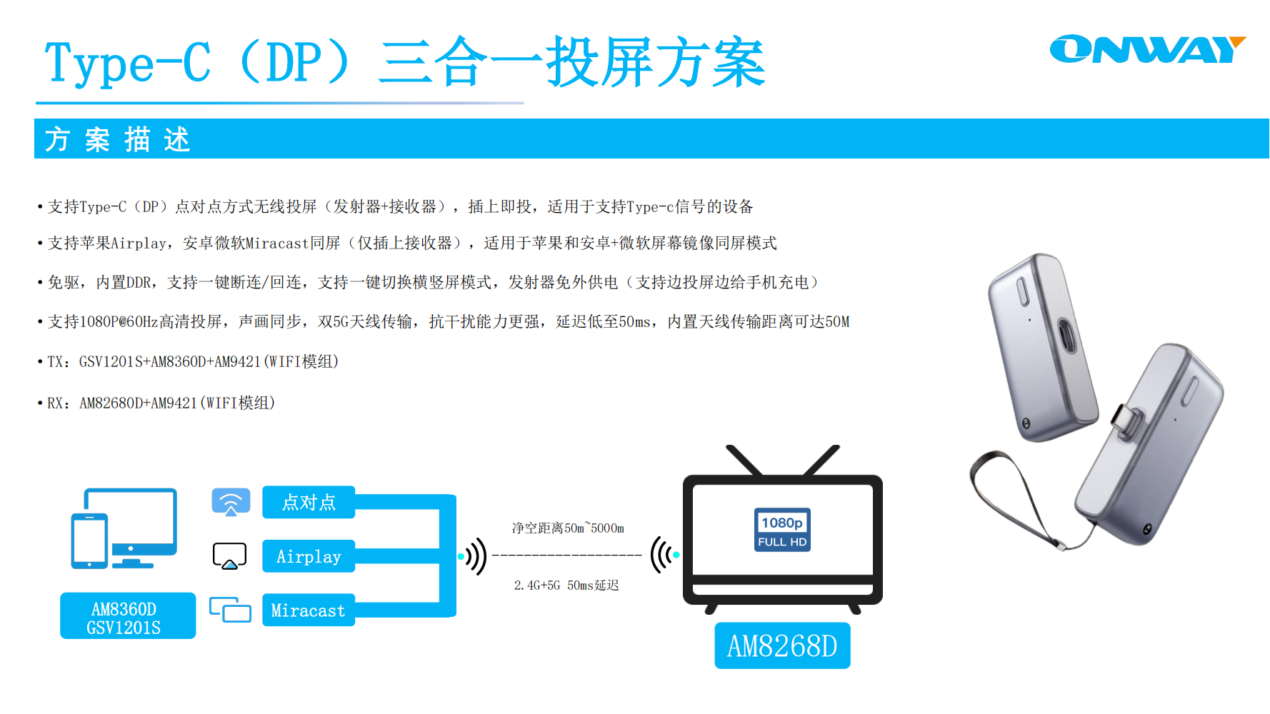 支持Type-C(DP)點(diǎn)對(duì)點(diǎn)方式無線投屏(發(fā)射器+接收器),插上即投,適用于支持Type-c信號(hào)的設(shè)備