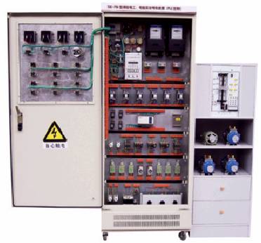 該裝置按標(biāo)準(zhǔn)電氣控制柜設(shè)計制造規(guī)格,充分利用雙面位置,柜內(nèi)裝有完成各種照明電路所需的單相電度表、日光燈、單聯(lián)開關(guān)、插座、感應(yīng)開關(guān)、漏電開關(guān)等,以及電氣控制所需要的多種低壓電器,如漏電斷路器、熔斷器、電流互感器、交流接觸器、時間繼電器、熱繼電器、中間繼電器、行程開關(guān)、按鈕、信號燈、轉(zhuǎn)換開關(guān)、電壓表、電流表、功率表及電度表等,為了延長電器使用壽命,各電器的接點都與接線端子相連,再由接線端子與被控制電氣連接。