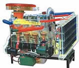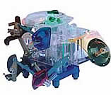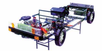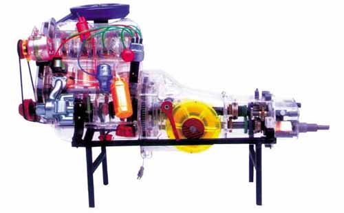 本品選用透明有機玻璃制作,內中部件均以硬質塑料料加工,用 螺絲固定在金屬高溫烘漆而成的車架上。各總成部分都以壓模成形加 工,代替過去膠粘合的方法,使產(chǎn)品在強度上有很大提高。發(fā)動機總成用電機驅動,在油門處設有調速裝置,能演示發(fā)動機轉速高低。離合器分離明顯,操縱靈活,離合器外殼整體壓模而成,變速箱和各檔齒輪用各種顏色表示,換檔靈活,手制動美觀。后橋外形壓模而成,內中主減速、差速轉動自如,輪轂剎蹄壓模成型,剎蹄可調節(jié),前橋輪鼓可調整,轉向裝置以及電瓶、油箱、水箱,制動管路分布清楚一目了然。電路采用對插件前后分布,燈架、風窗、儀表板、后燈架用透明有機玻璃壓模成整體美觀逼真。