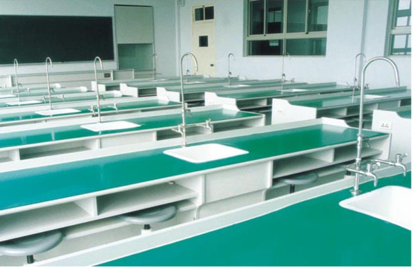 (2)材質:生物學生桌主體材料采用吸水性較小的密度板,臺面則采用耐酸堿性較好的美國著名品牌富美佳防火板,經后成型機熱彎成型,其厚度為25mm。