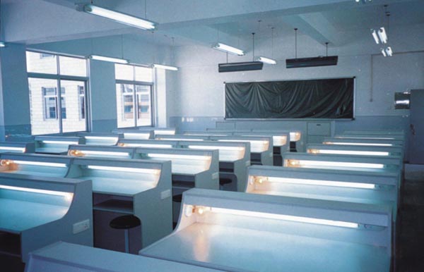 1、 采用電子日光燈,兩人一組,由教師主控臺分組控制,并選用漏電保護裝置,使220V交流電源到位。