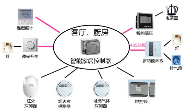 智能電子產品系統(tǒng)網絡示意圖 1. 家庭控制中心說明: 客廳廚房控制中心 客廳廚房控制中心包含智能家居控制器、電控鎖、多功能面板、節(jié)能燈、排氣扇、智能調光開關、智能光強及溫濕度計、智能插座、電茶壺、可燃氣體探測器、煙火災探測器及紅外探測器。 電控鎖通過智能家居控制器控制門的開啟;多功能面板控制客廳、廚房燈的開關;智能調光開關調節(jié)LED燈的亮度、也可通過485總線與智能家居控制器通訊,通過情景模式智能調節(jié)LED燈的亮度;智能光強及溫濕度計顯示采集客廳溫濕度及光照度;智能插座控制和采集電茶壺的電源和電量信息,可合理分配用電負荷;可燃氣體探測器、煙火災探測器及紅外探測器用于組件家居系統(tǒng)的安防系統(tǒng)。 多功能面板、智能調光開關、智能光強及溫濕度計、智能插座通過485總線與智能家居控制器通訊,可燃氣體探測器、煙火災探測器、紅外探測器及電控鎖通過I\O口與智能家居控制器通訊。